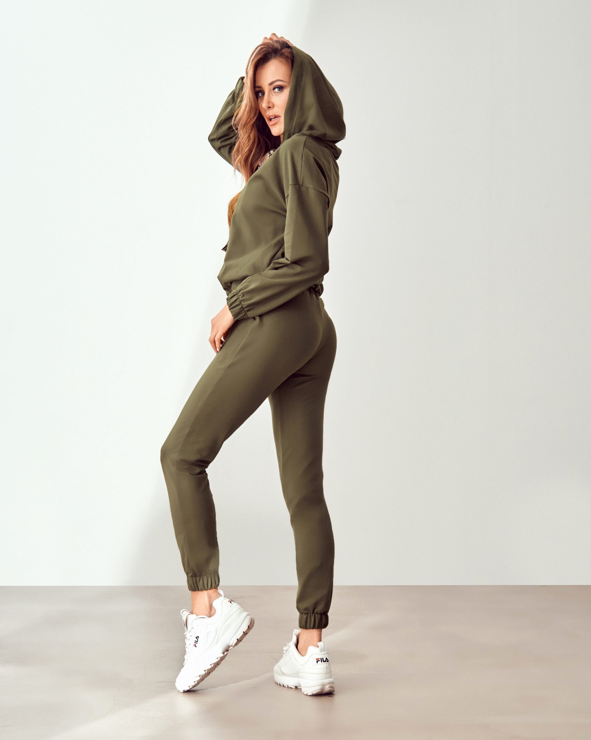 Komplet dresowy wykonany z dzianiny bawełnianej. Bluza z kapturem wykończona dekoracyjną taśmą nada charakter Twojej stylizacji! Spodnie z gumką w pasie wykończone dekoracyjną taśmą. Idealna propozycja na weekendowy wypoczynek