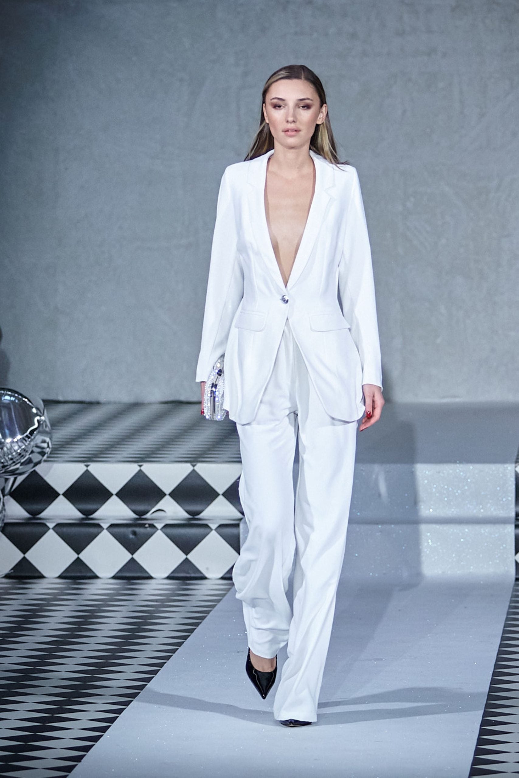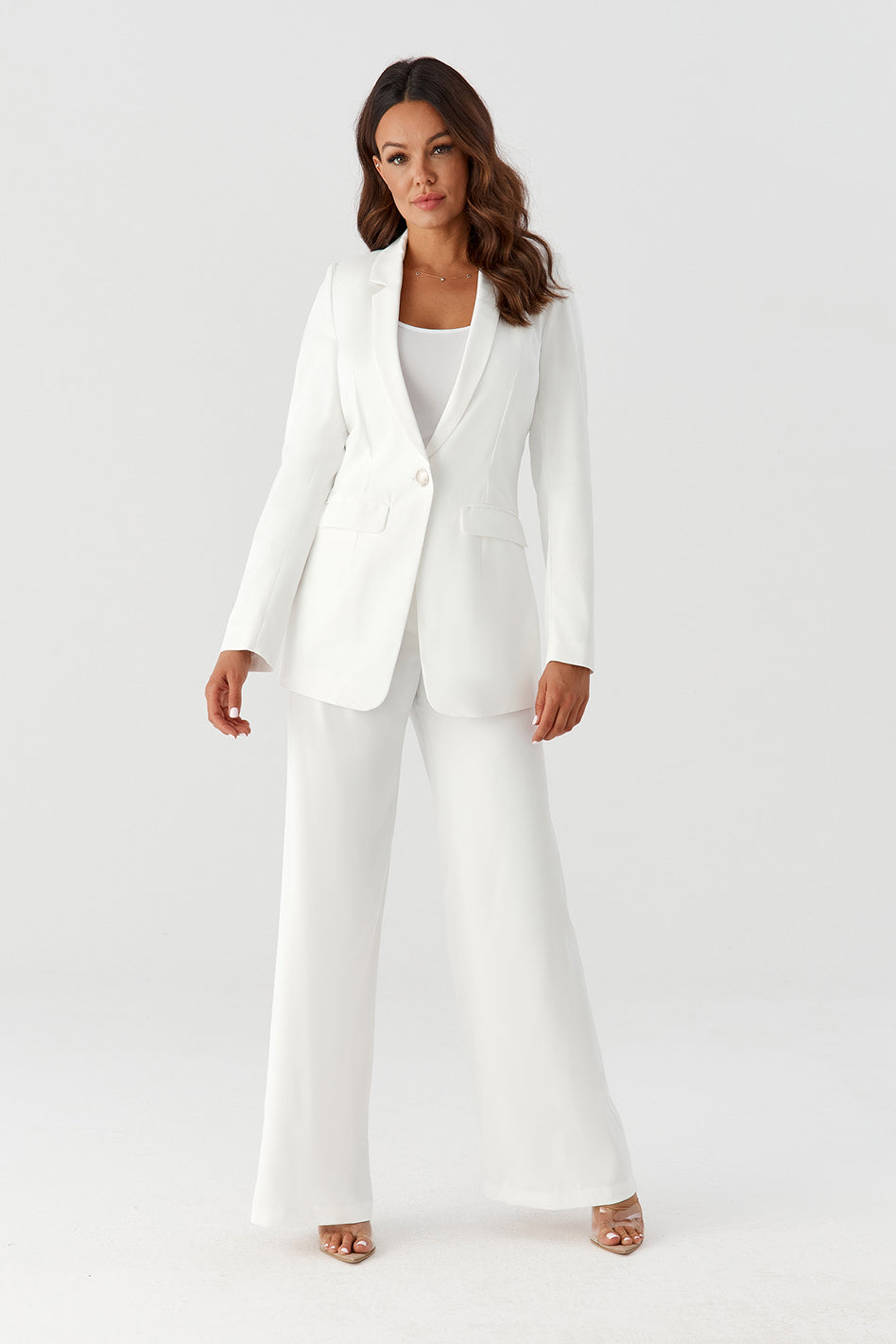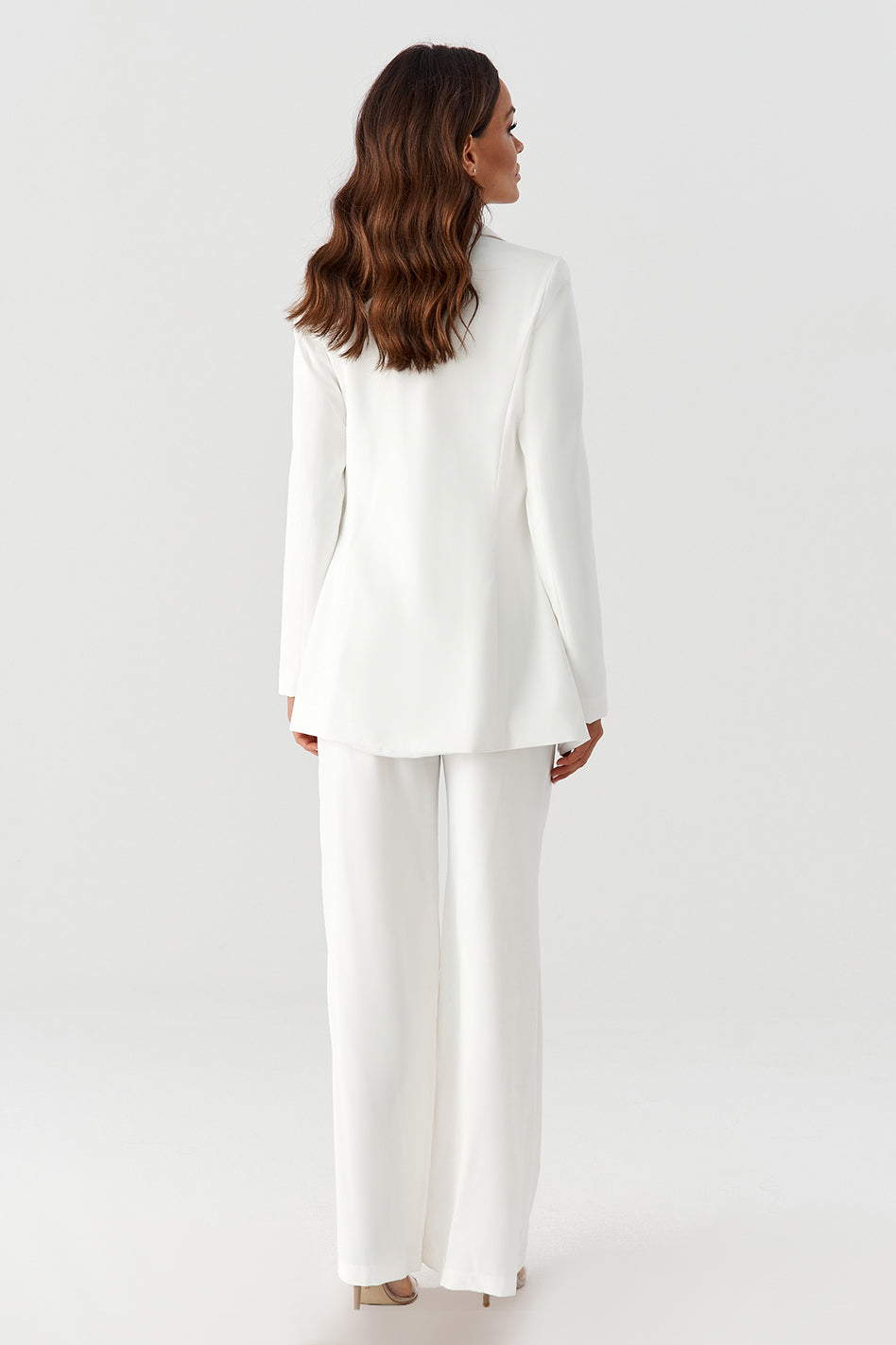 - Skład zestawu: dłuższa marynarka i spodnie z szeroką prostą nogawką