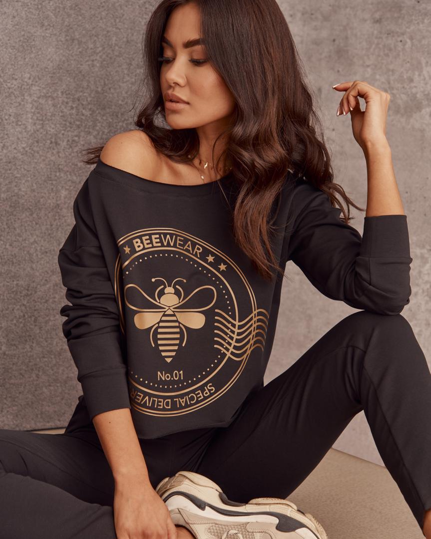 Krótka bluza ze złotą aplikacją, doda niepowtarzalnego charakteru Twojej stylizacji! A wraz ze spodniami z wyższym stanem stworzy świetny zestaw. Cały dres uszyty jest z dzianiny bawełnianej.