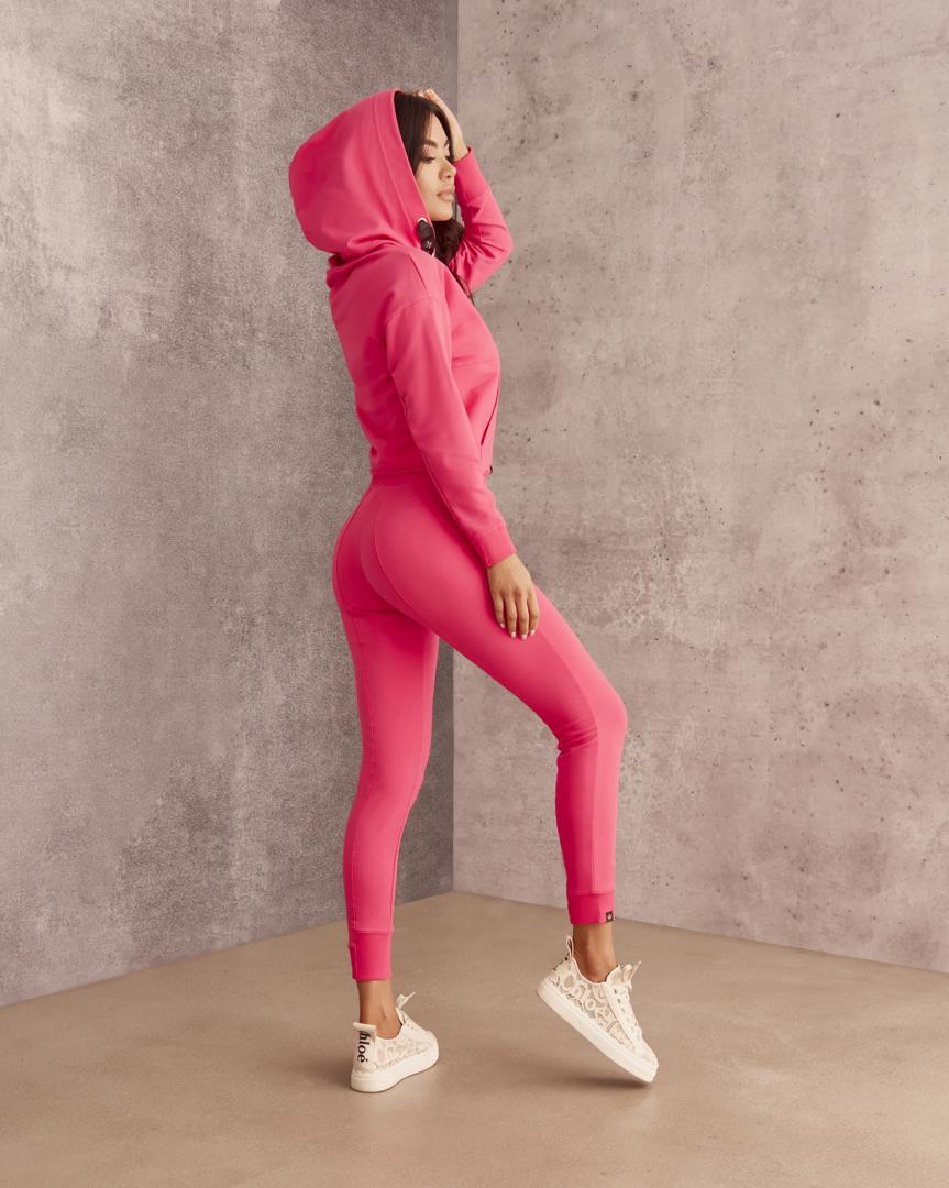 Krótka bluza kangurka z kapturem, doda niepowtarzalnego charakteru Twojej stylizacji! A wraz ze spodniami z wyższym stanem stworzy świetny zestaw. Cały dres uszyty jest z dzianiny bawełnianej.