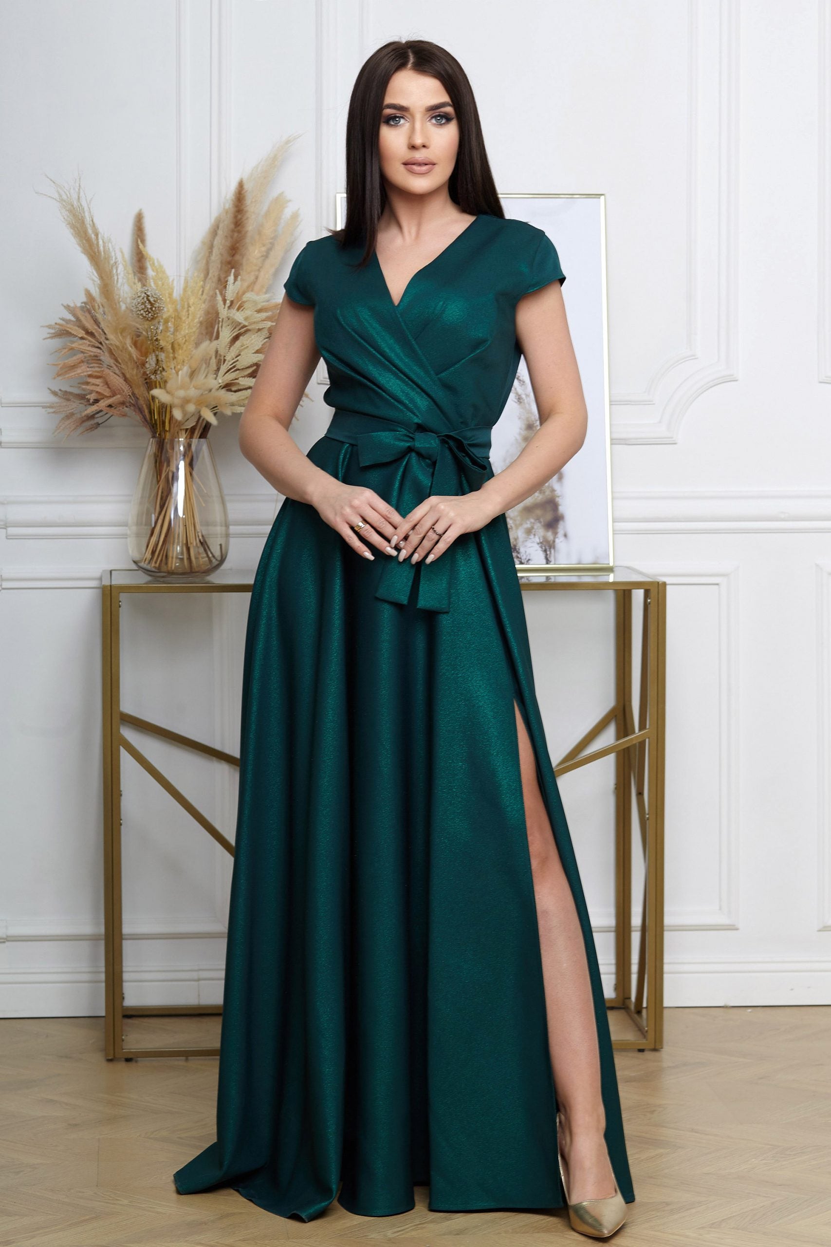 Dużym atutem tej sukienki jest metalicznie połyskujący materiał, który wydobywa głębię kolorów co czyni sukienkę jeszcze bardziej atrakcyjną.