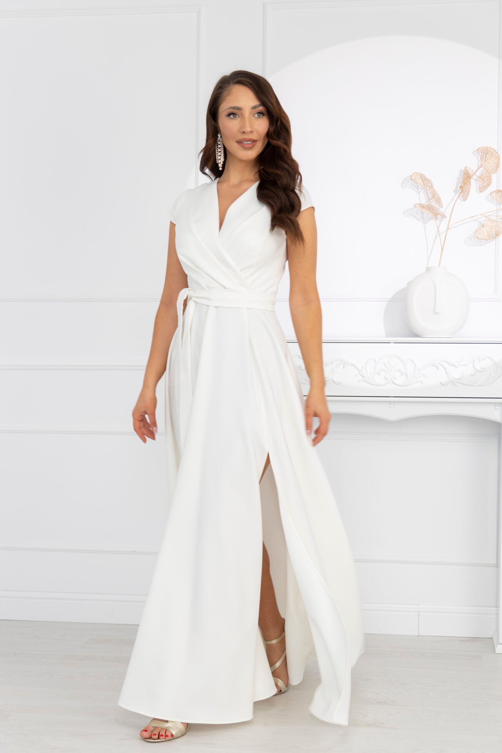 ALEXIS – to suknia ślubna, która podbiła serca kobiet w różnym wieku. To idealny przykład klasycznej elegancji i oraz nowoczesnego stylu. Fason starannie dopracowany tak, by pasował do sylwetek w różnych rozmiarach – podkreślając kobiece wdzięki, jednocześnie tuszując drobne niedoskonałości. Kopertowy dekolt, wcięcie w tali i luźno puszczone biodra wysmuklają sylwetkę, i sprawiają, że wygląda ona zgrabnie, zapewniając przy tym niezwykłą wygodę noszenia. Rozcięcie na nodze dodaje jej zwiewności i lekkości. Całość dopełnia pasek, który można zawiązać w dowolny sposób.