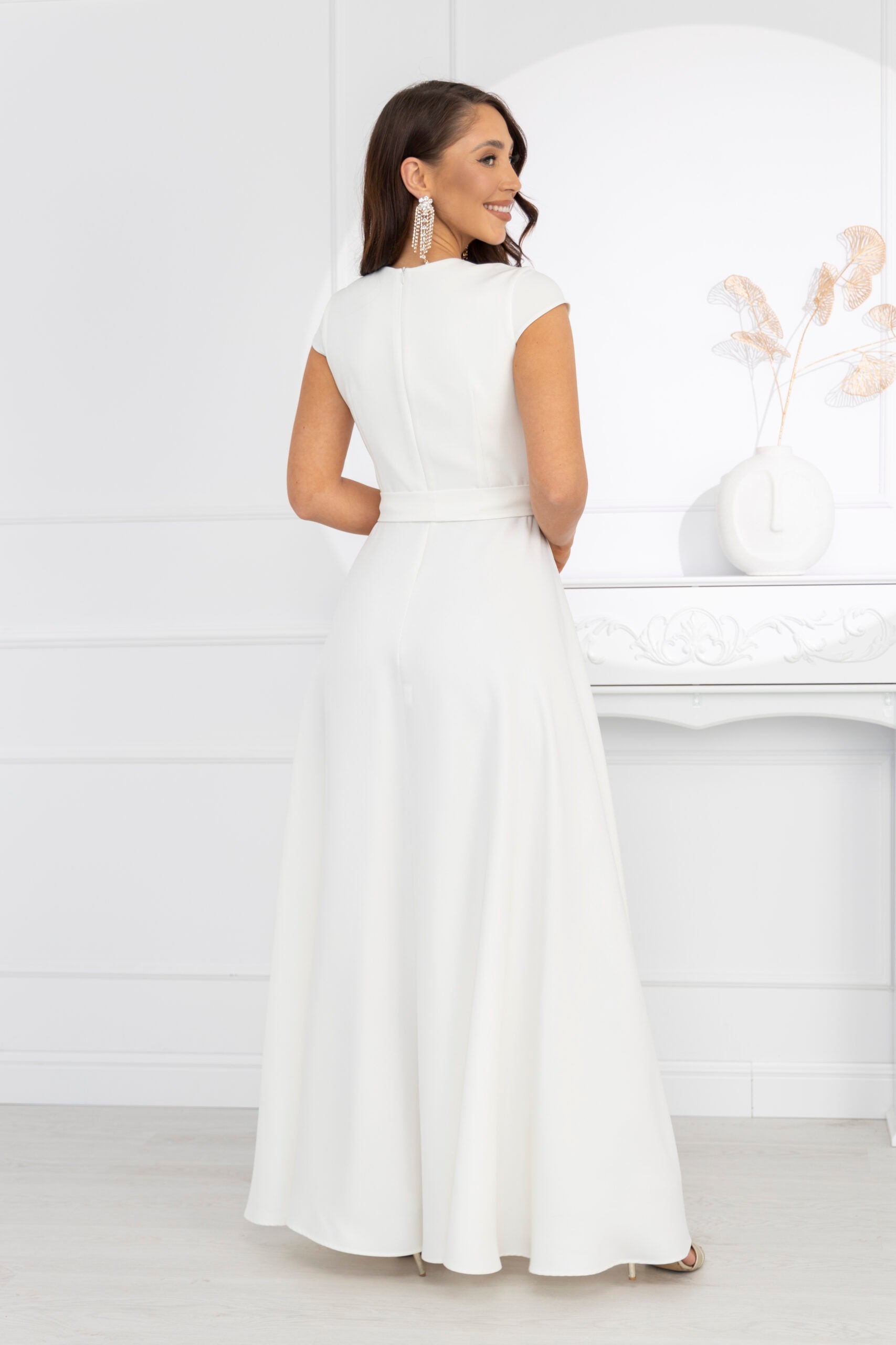 Dużym atutem tej sukienki jest wysokiej jakości materiał z mieniącymi się drobinkami, co podkreśla jej wizytowy charakter. Drobinki wspaniale połyskują, w materiałe. Nie jest to brokat.To zdecydowanie bardzo modna sukienka. Nasza ALEXIS ecru, to harmonijne połączenie klasyki i nowoczesności, tworzące niezapomniany look dla każdej przyszłej panny młodej. Niezwykle elegancka, długa sukienka, idealnie się sprawdzi jako sukienka na poprawiny.