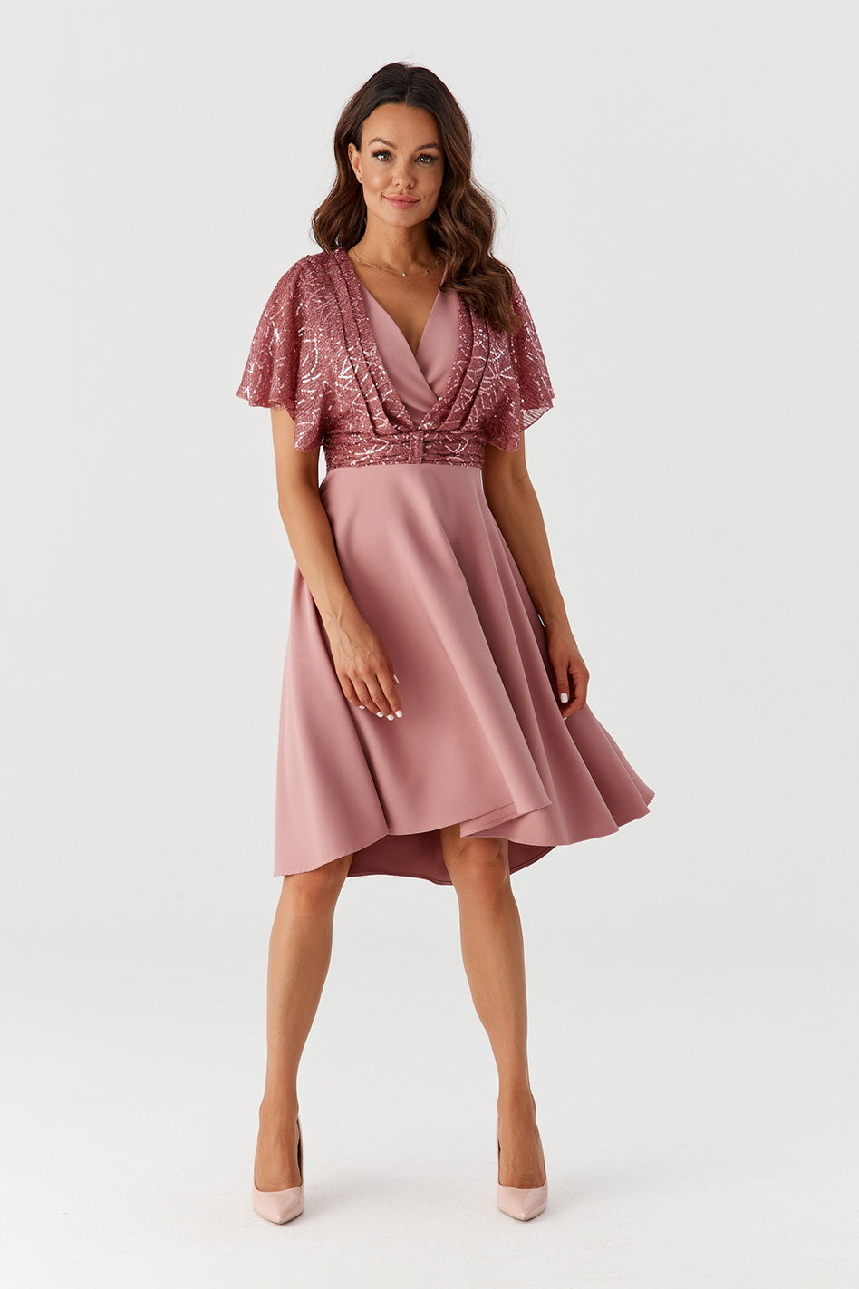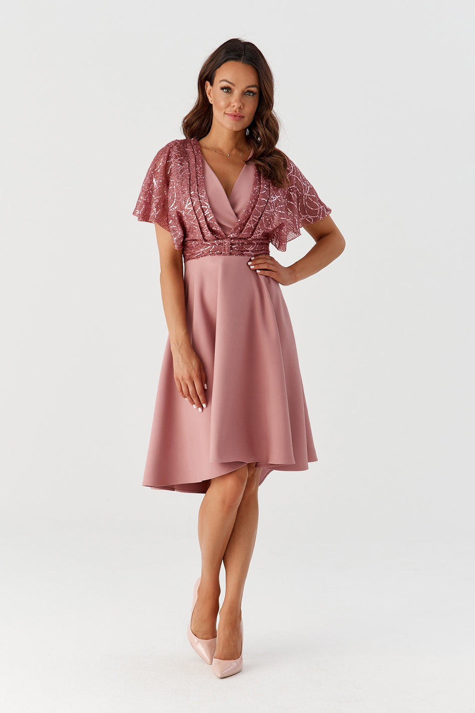 Połączenie połyskujących cekinów i gładkiego materiału sprawia, że jest to jednocześnie sukienka elegancka, jak również bardzo wytworna. Świetnie zaprojektowany dekolt sprawia, że biust prezentuje się niezwykle atrakcyjnie, natomiast wcięcie w talii i luźno puszczone biodra wysmuklają sylwetkę, i sprawiają, że wygląda ona bardzo zgrabnie. Swiecące cekiny dodają jej charakteru.