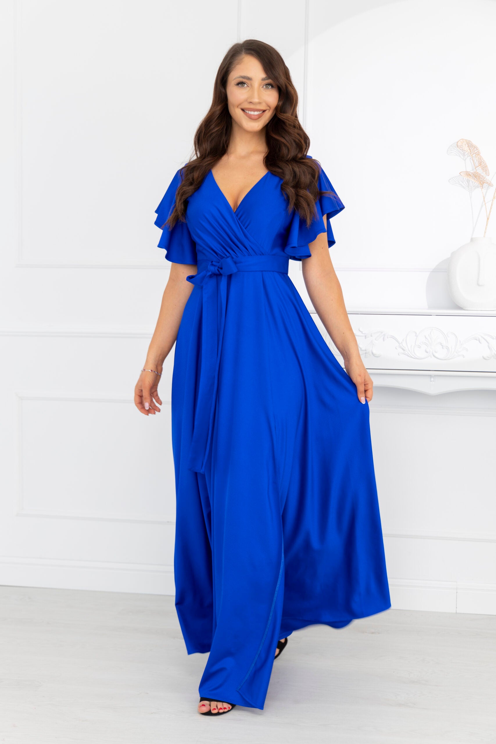 To bardzo modna sukienka. Zwiewne rękawki zakrywają ramiona, a całość dopełnia pasek, który można zawiązać w dowolny sposób.
