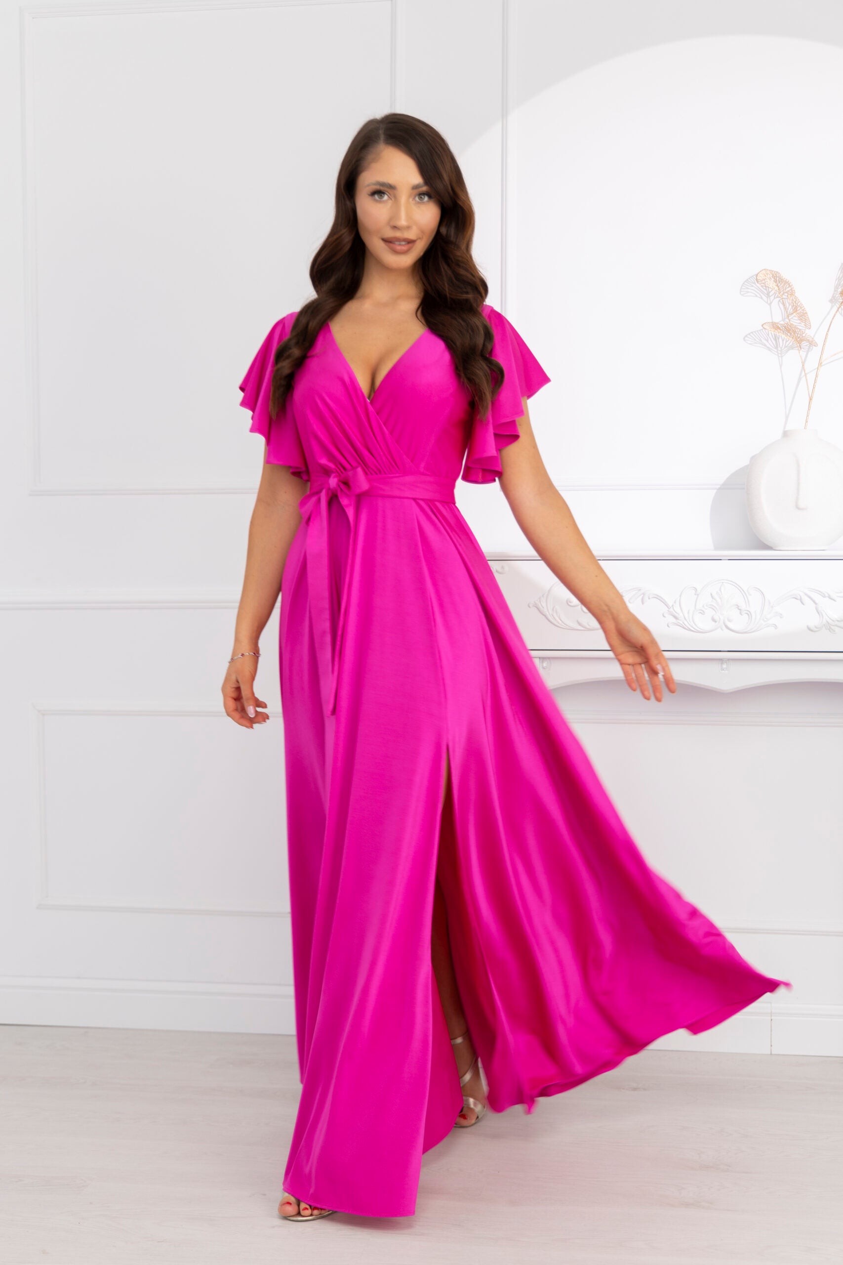 INES – to sukienka wieczorowa z luksusowej kolekcji PREMIUM!. To idealny przykład sukienki na wesele. Fantastycznie eksponuje kobiece wdzięki, jednocześnie tuszując drobne niedoskonałości. Wcięcie w talii i luźno puszczone biodra wysmuklają sylwetkę, i sprawiają, że wygląda ona zgrabnie, zapewniając przy tym niezwykłą swobodę noszenia. Rozcięcie z przodu dodaje jej zwiewności i lekkości. Dużym atutem tej sukienki jest wysokiej jakości, POŁYSKUJĄCY materiał, który się uciąga. W pasie znajduje się gumka, która zdecydowanie poprawia komfort noszenia.