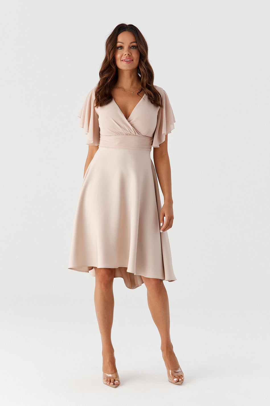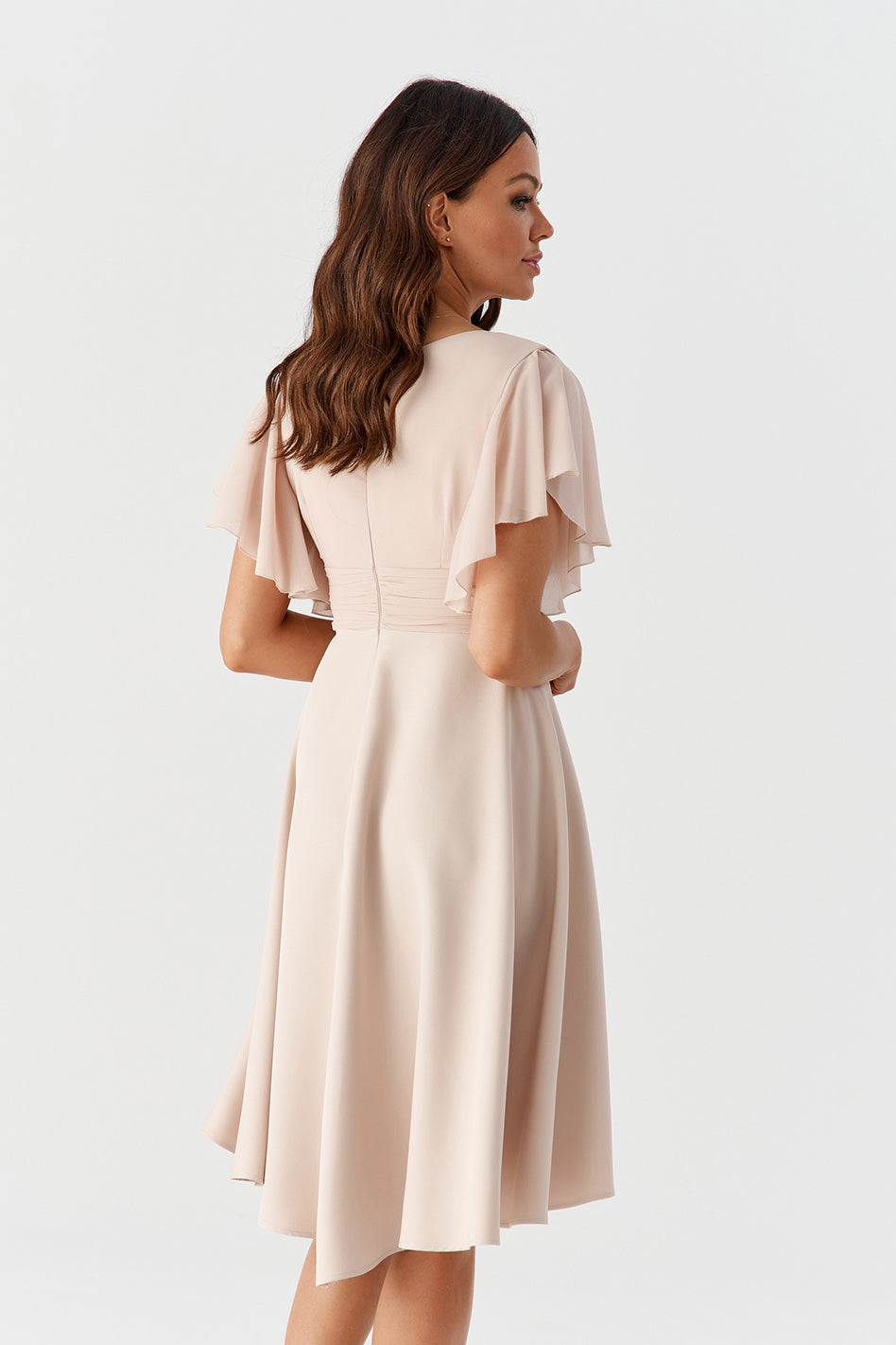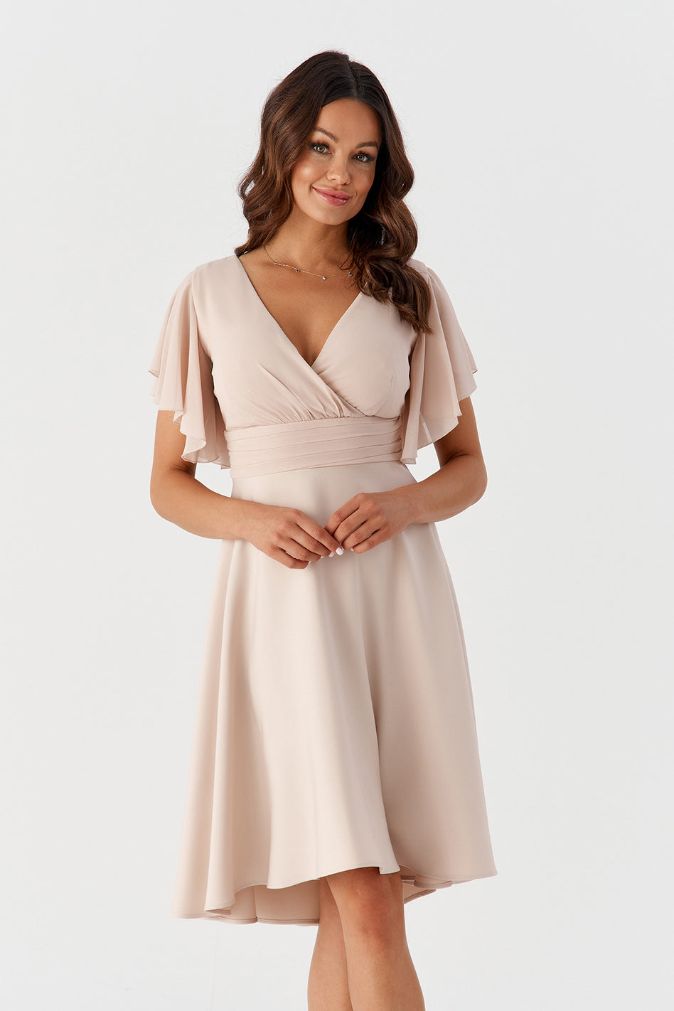 Połączenie zwiewnego szyfonu i gładkiego materiału sprawia, że jest jednocześnie sukienka elegancka, jak również bardzo delikatna. Świetnie zaprojektowany dekolt sprawia, że biust prezentuje się niezwykle atrakcyjnie, natomiast wcięcie w talii i luźno puszczone biodra wysmuklają sylwetkę, i sprawiają, że wygląda ona bardzo zgrabnie. Delikatne i zwiewne rękawki nadają jej lekkości.