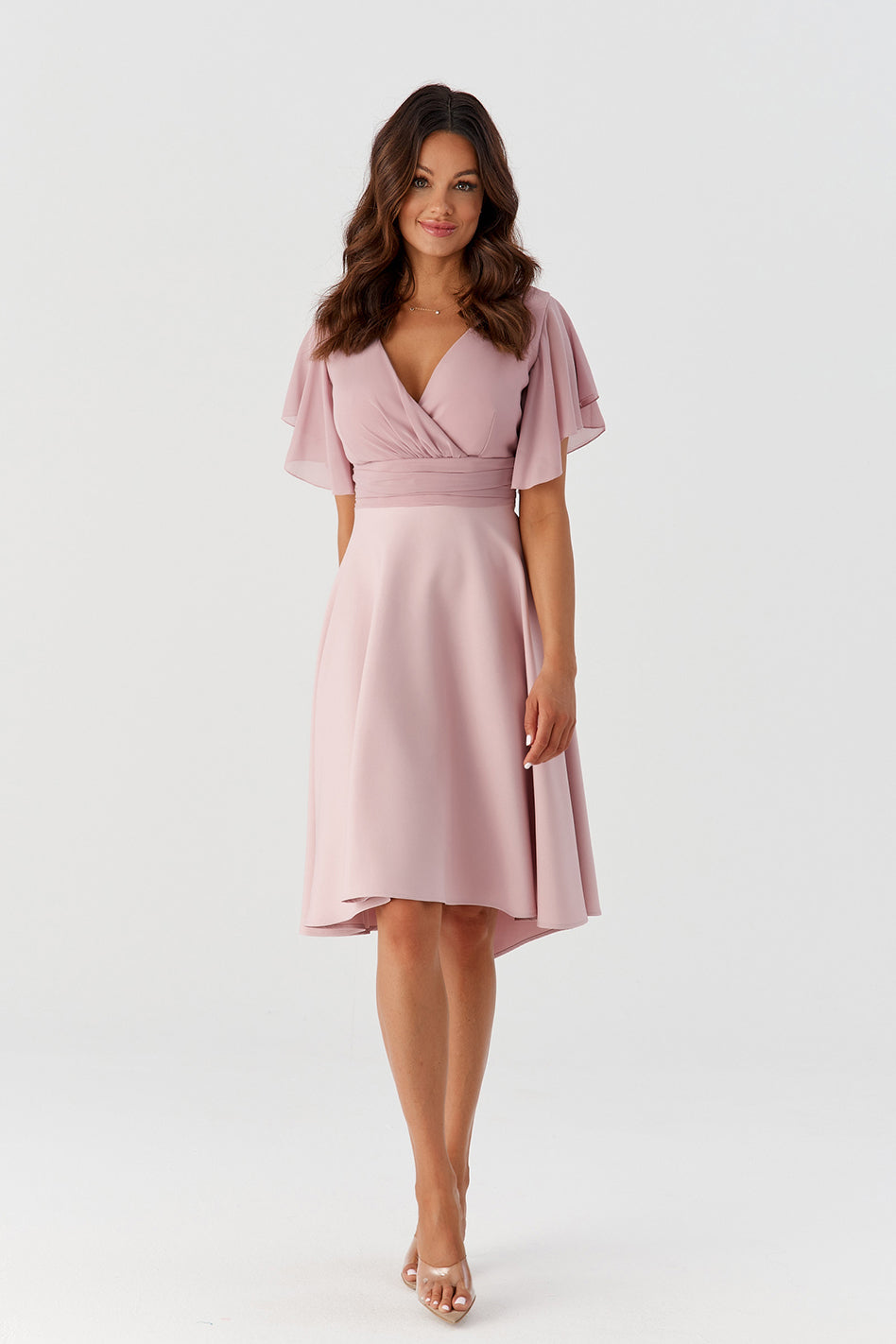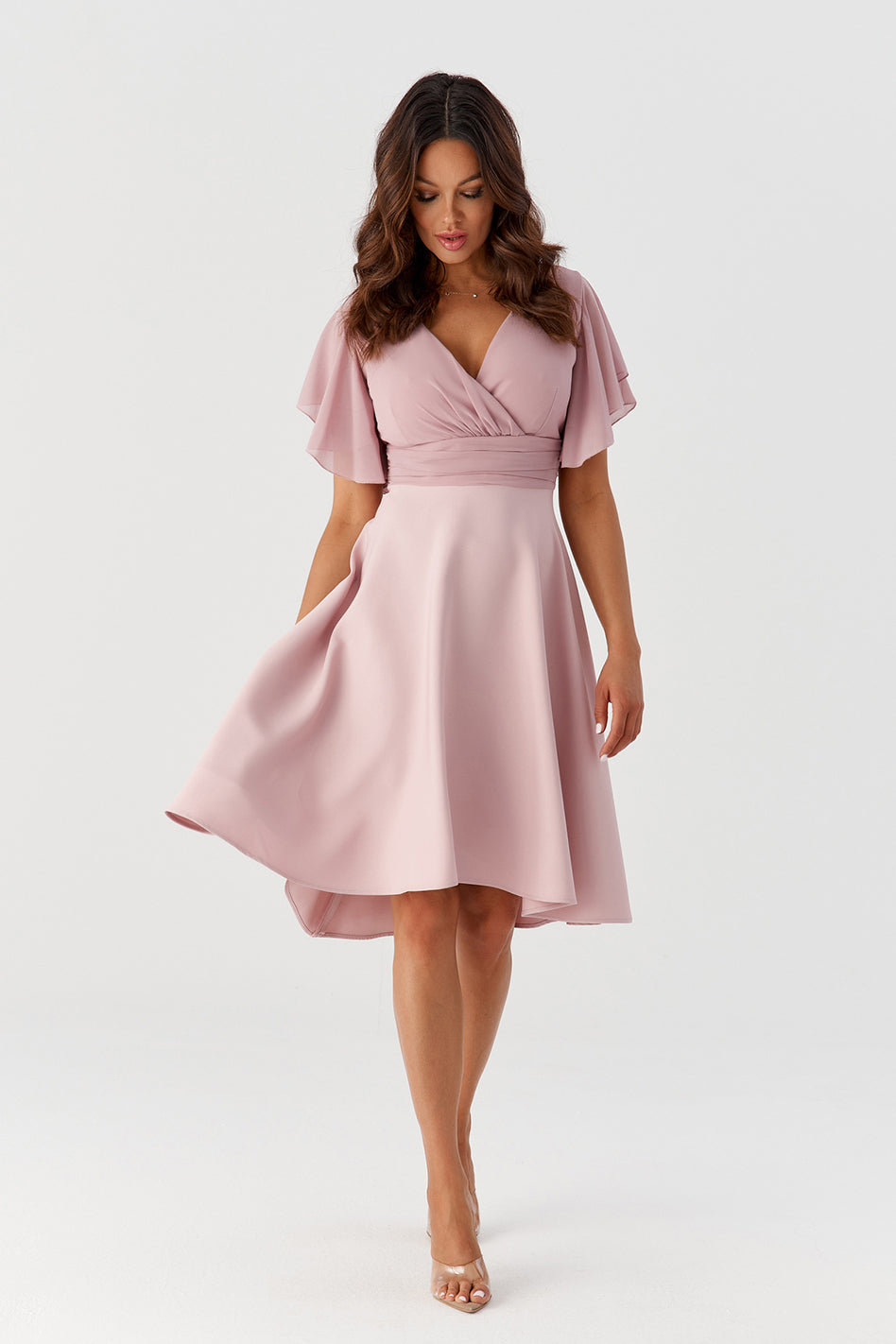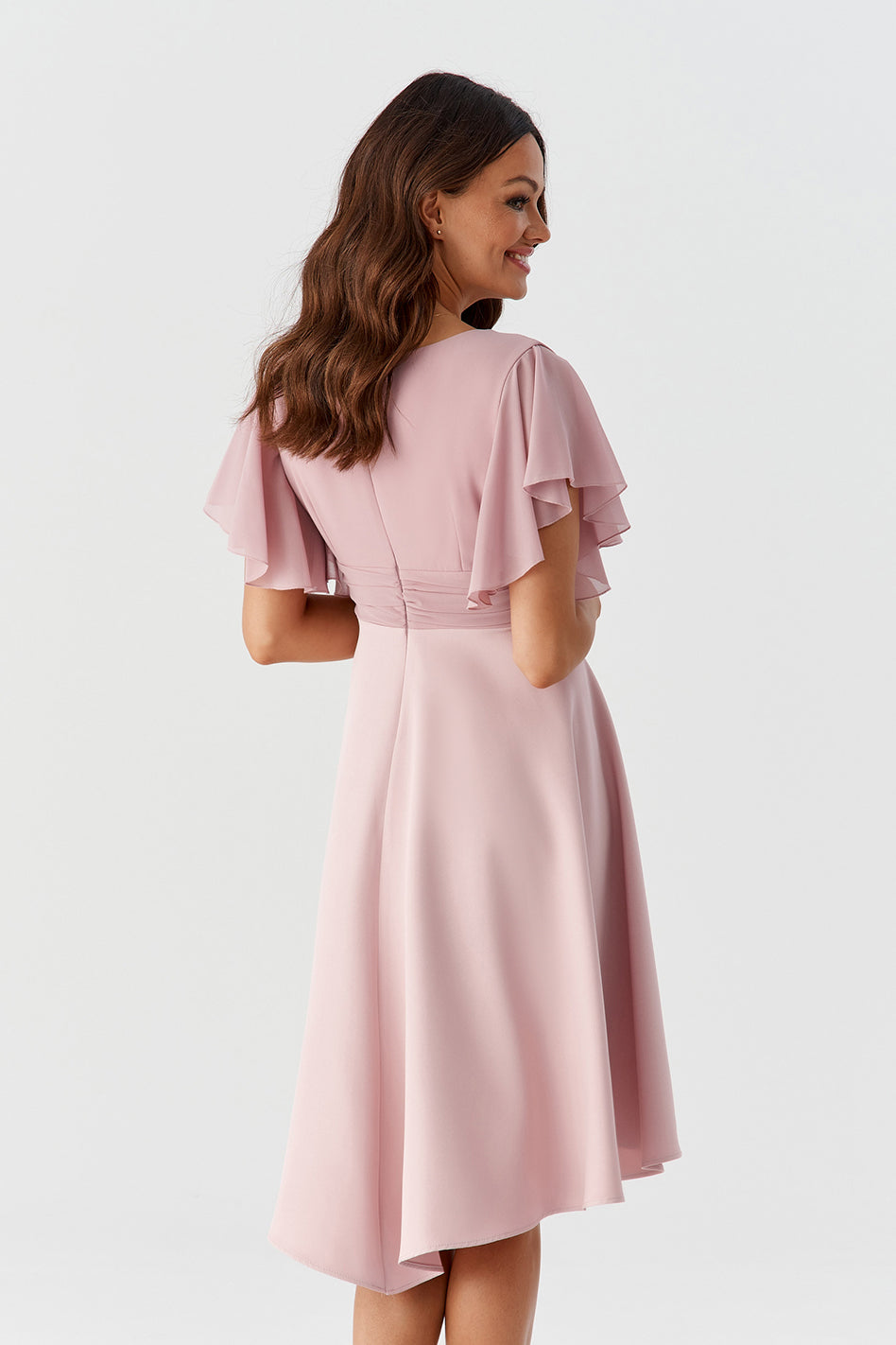 Połączenie zwiewnego szyfonu i gładkiego materiału sprawia, że jest jednocześnie sukienka elegancka, jak również bardzo delikatna. Świetnie zaprojektowany dekolt sprawia, że biust prezentuje się niezwykle atrakcyjnie, natomiast wcięcie w talii i luźno puszczone biodra wysmuklają sylwetkę, i sprawiają, że wygląda ona bardzo zgrabnie. Delikatne i zwiewne rękawki nadają jej lekkości.