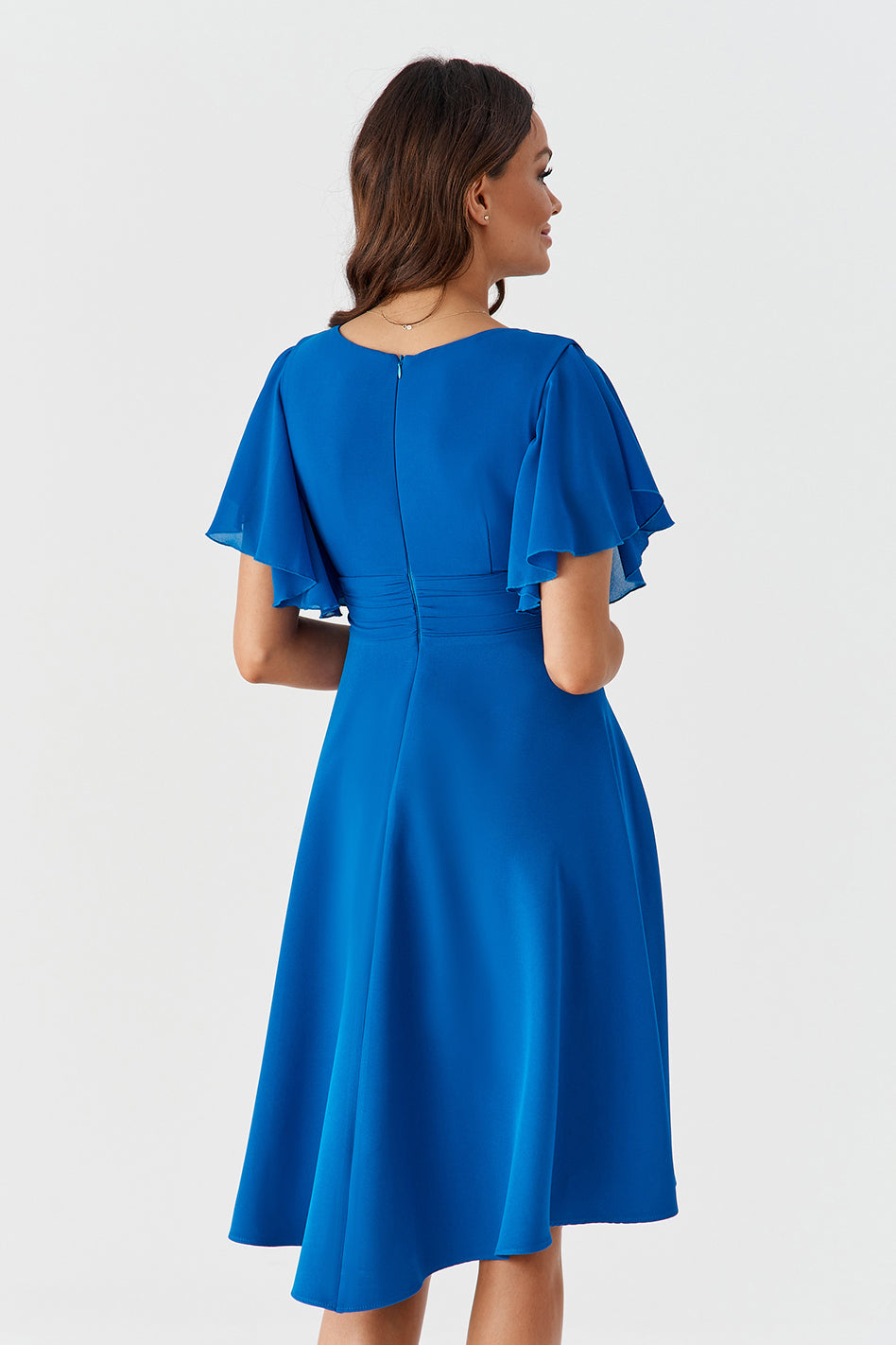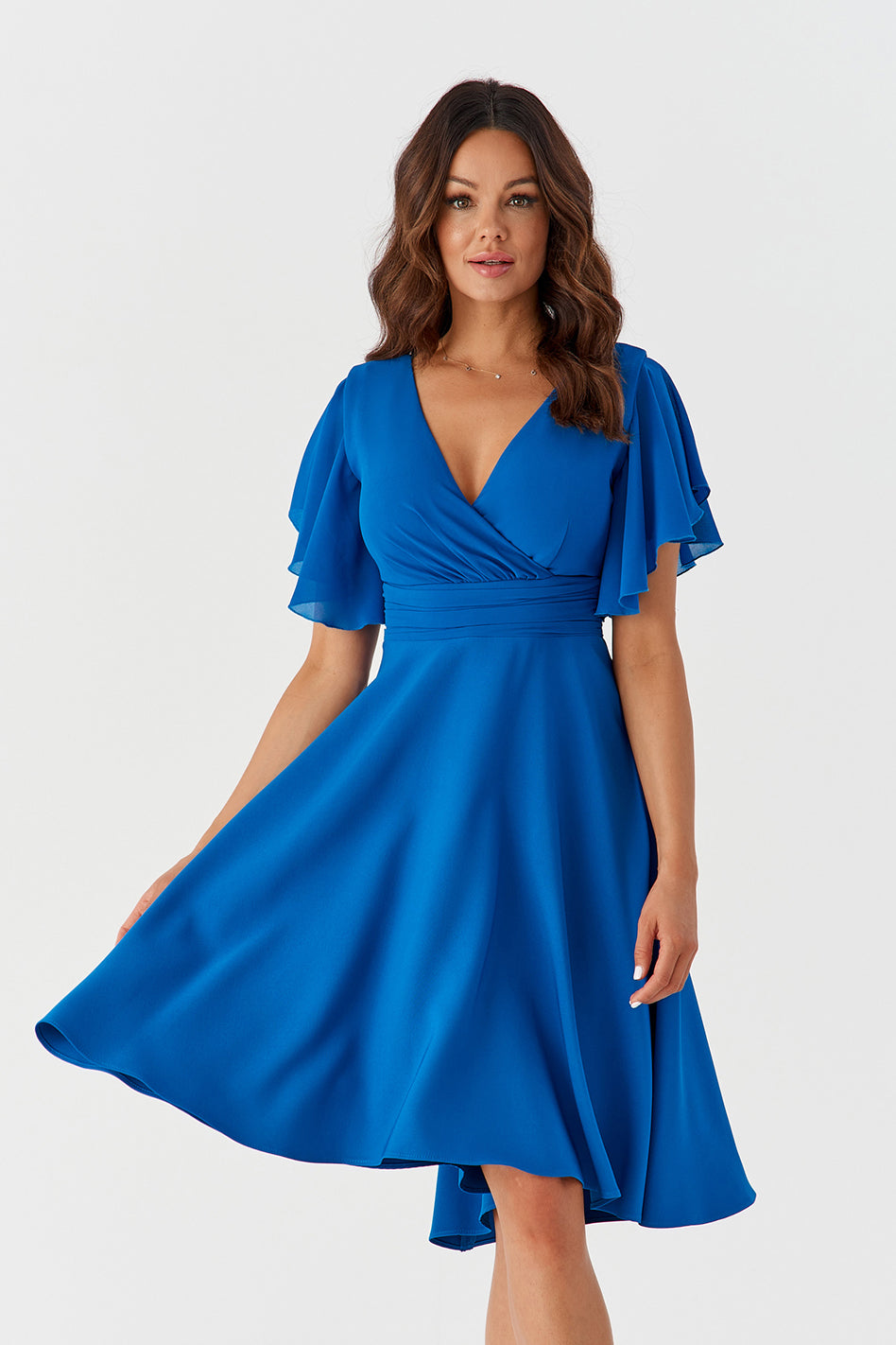 Połączenie zwiewnego szyfonu i gładkiego materiału sprawia, że jest jednocześnie sukienka elegancka, jak również bardzo delikatna. Świetnie zaprojektowany dekolt sprawia, że biust prezentuje się niezwykle atrakcyjnie, natomiast wcięcie w talii i luźno puszczone biodra wysmuklają sylwetkę, i sprawiają, że wygląda ona bardzo zgrabnie. Delikatne i zwiewne rękawki nadają jej lekkości.