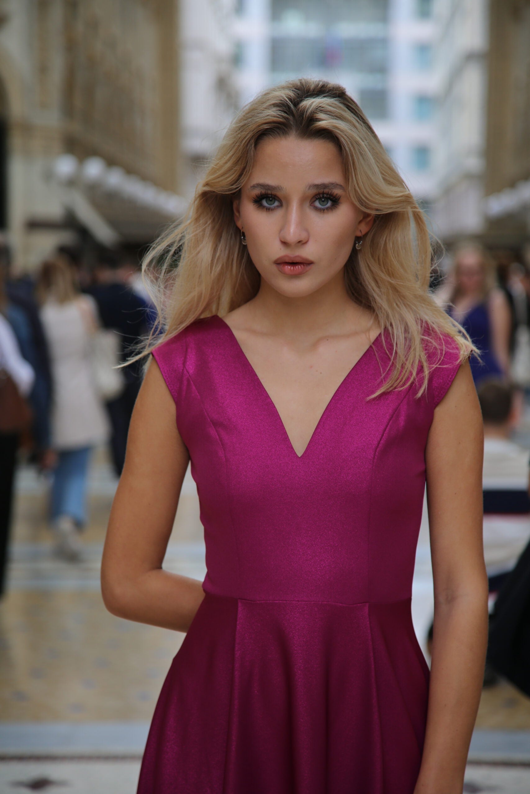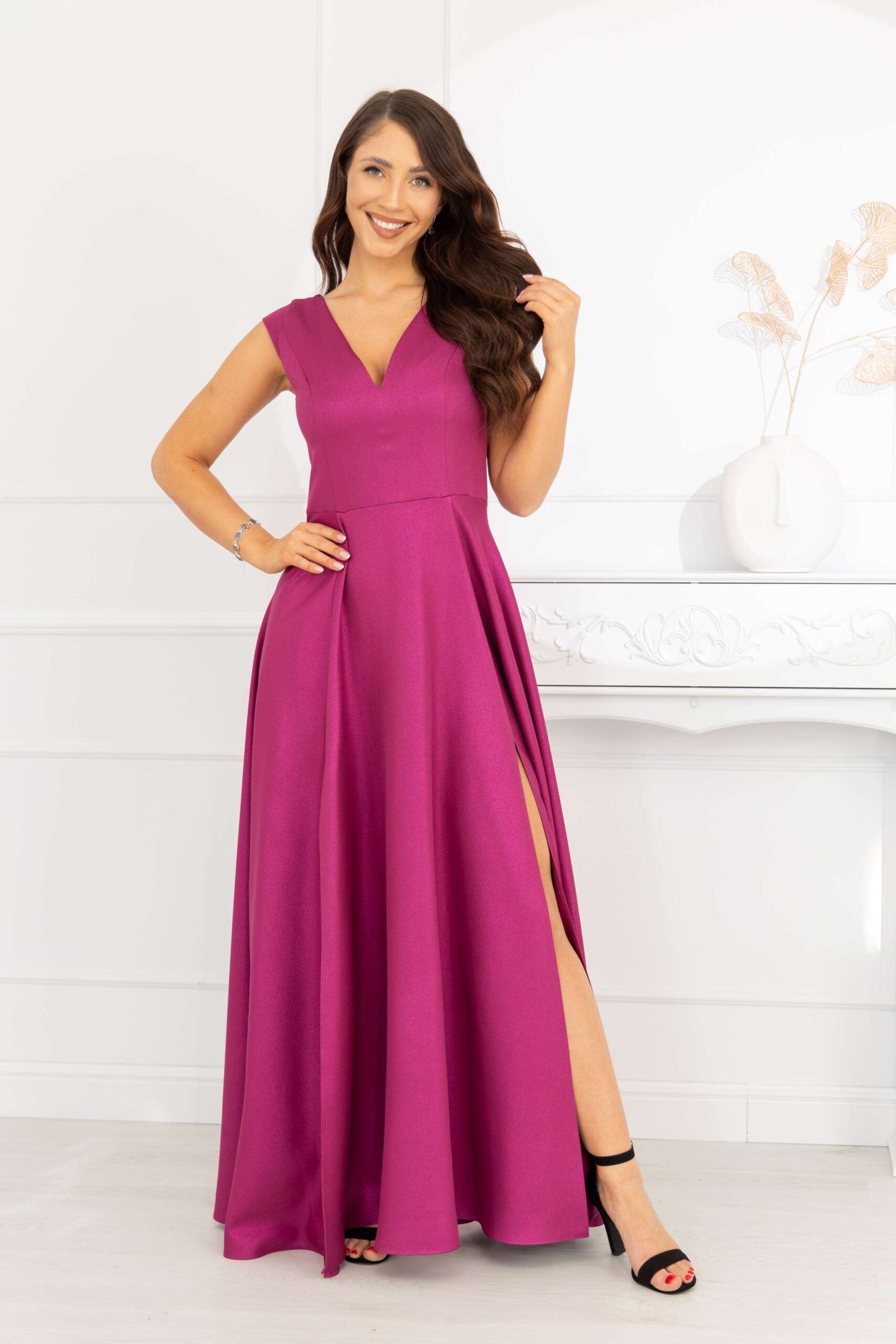 MILENA – to sukienka wieczorowa, która podbiła serca kobiet w różnym wieku. To idealny przykład sukienki na wesele. Fantastycznie eksponuje kobiece wdzięki, jednocześnie tuszując drobne niedoskonałości. Wcięcie w tali i luźno puszczone biodra wysmuklają sylwetkę, i sprawiają, że wygląda ona zgrabnie, zapewniając przy tym niezwykłą wygodę noszenia. Dwa rozcięcia z przodu dodają jej zwiewności i lekkości. Dużym atutem tej sukienki jest wysokiej jakości materiał z mieniącymi się drobinkami, co podkreśla jej wizytowy charakter. Drobinki wspaniale połyskują, ale co ważne nie sypią się! Nie jest to brokat. To zdecydowanie bardzo modna sukienka. Dzięki swej finezji i niepowtarzalności MILENA jest idealna jako sukienka na wesele. Świetnie się sprawdzi jako suknia wieczorowa, na mniejsze lub większe przyjęcia, bale karnawałowe, czy jako sukienka na studniówkę. Będziesz w niej wyglądać wytwornie i z pewnością olśnisz wszystkich wokół.