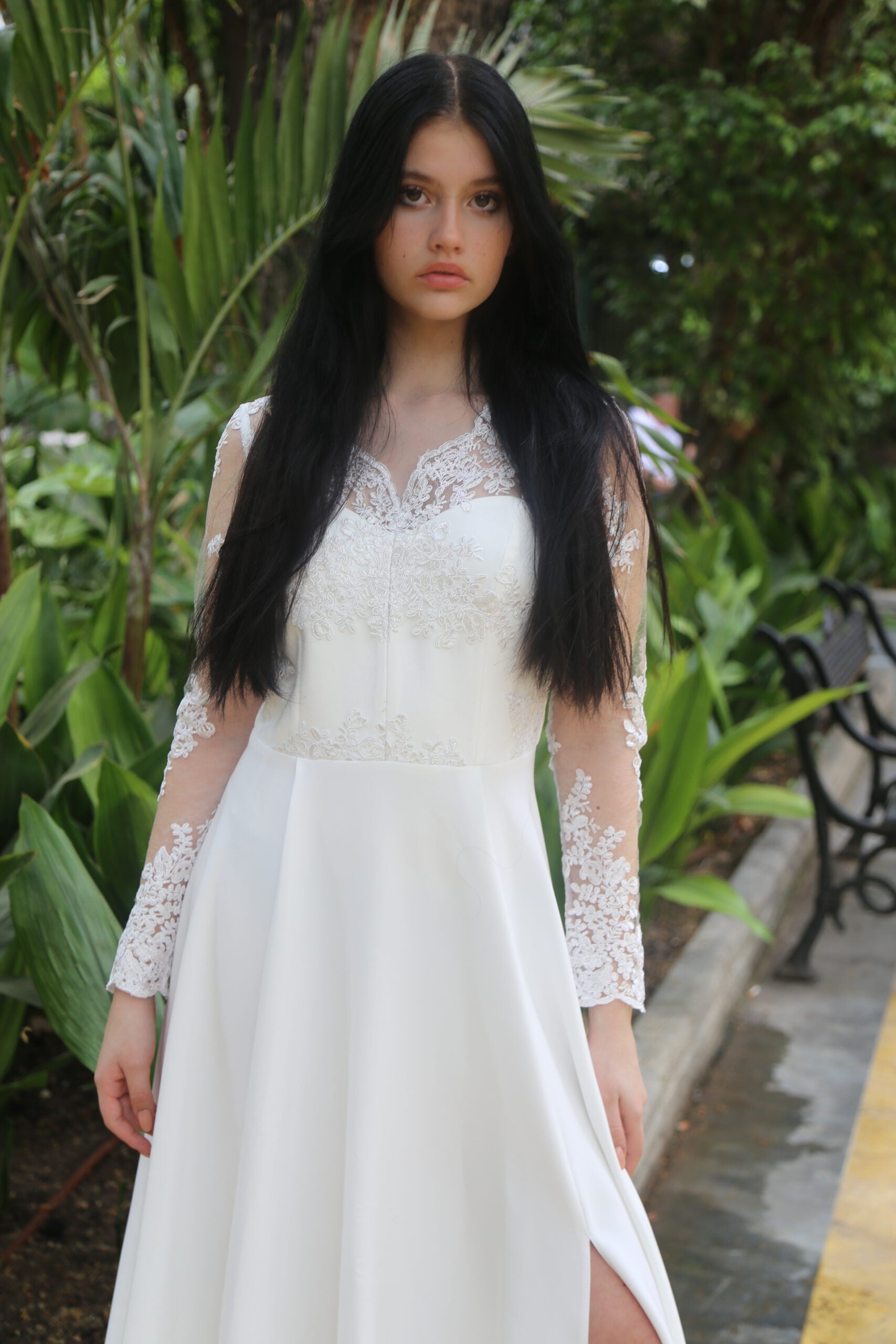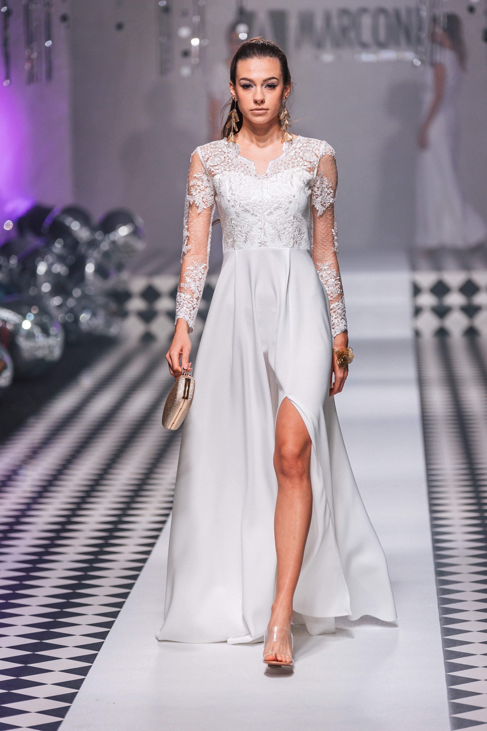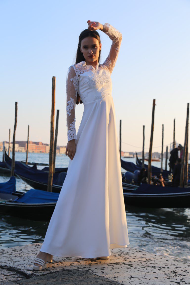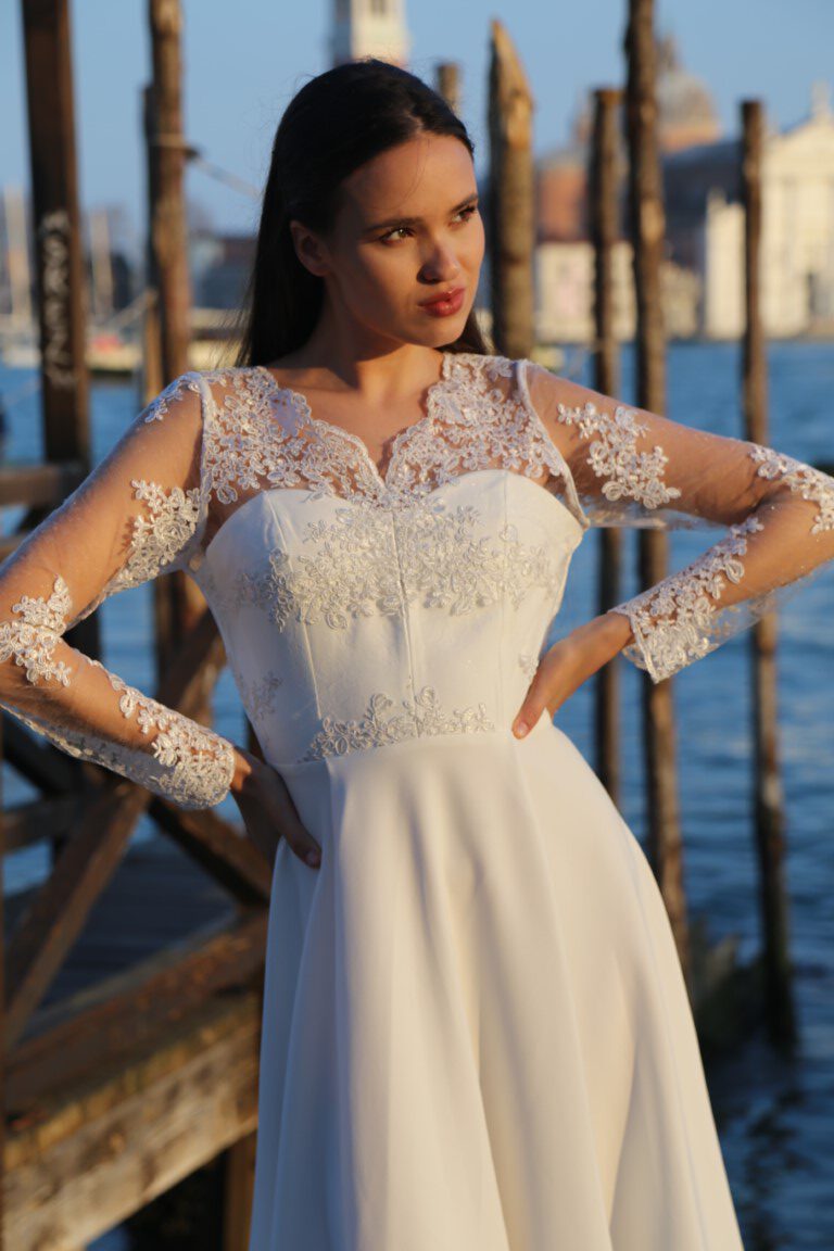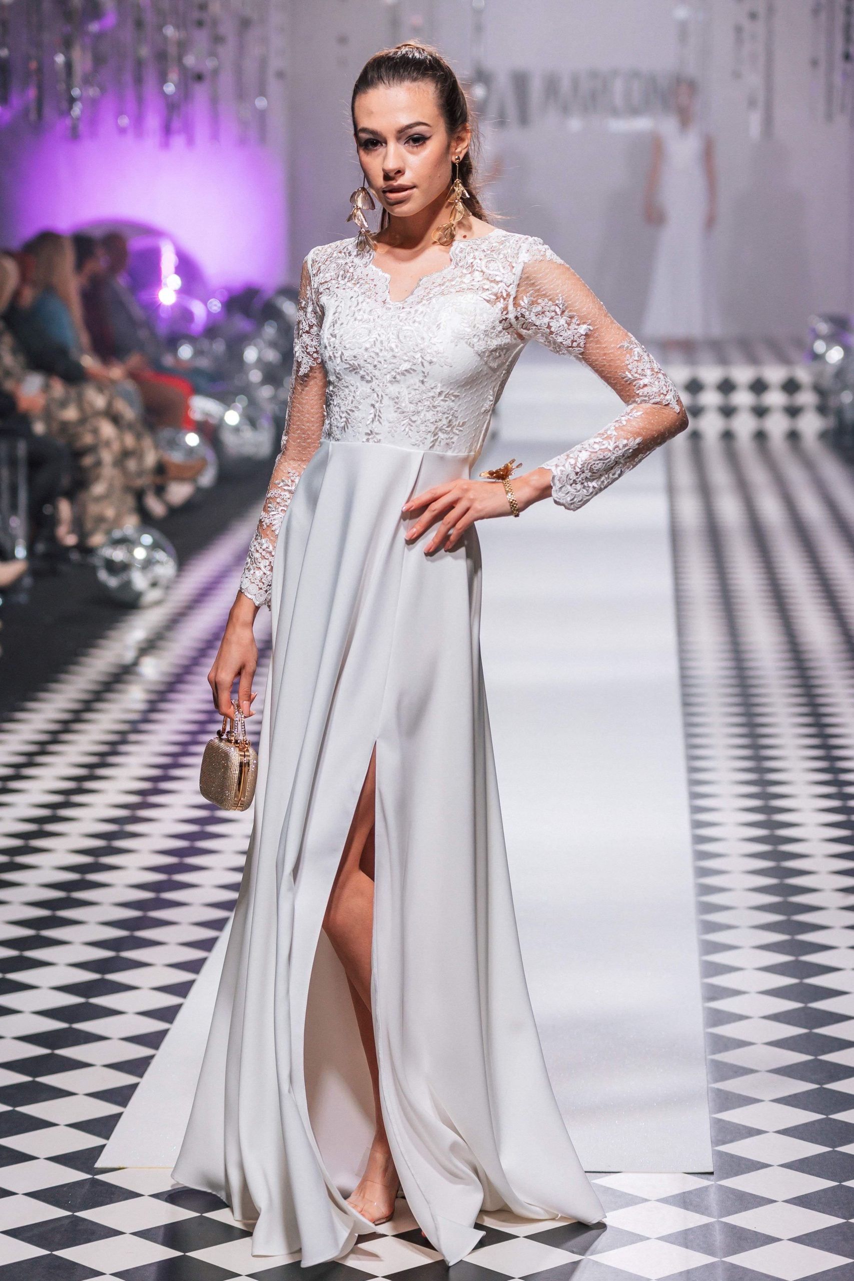 Zestawienie ponadczasowej koronki z delikatną tkaniną to niezapomniany look dla każdej przyszłej panny młodej. Dopasowana góra, i luźno puszczone biodra tworzą bardzo atrakcyjną całość. Zmysłowe rozcięcie na nodze nadaje jej lekkości i zwiewności, zapewniając przy tym niezwykłą swobodę noszenia.