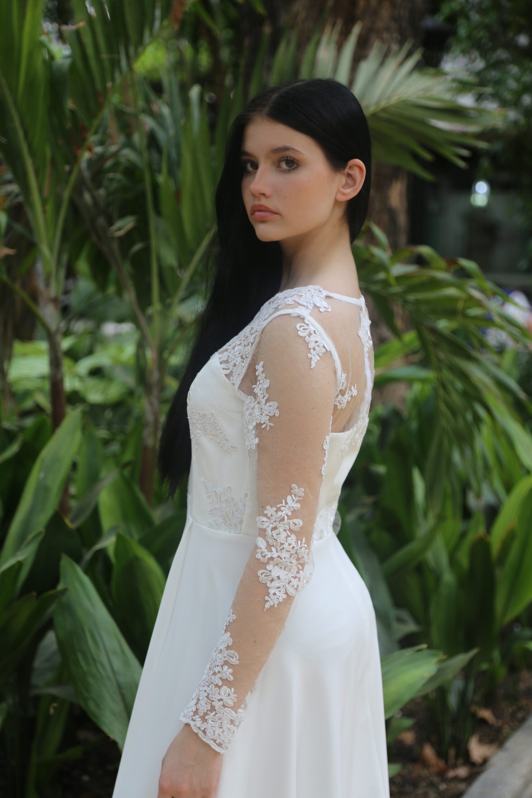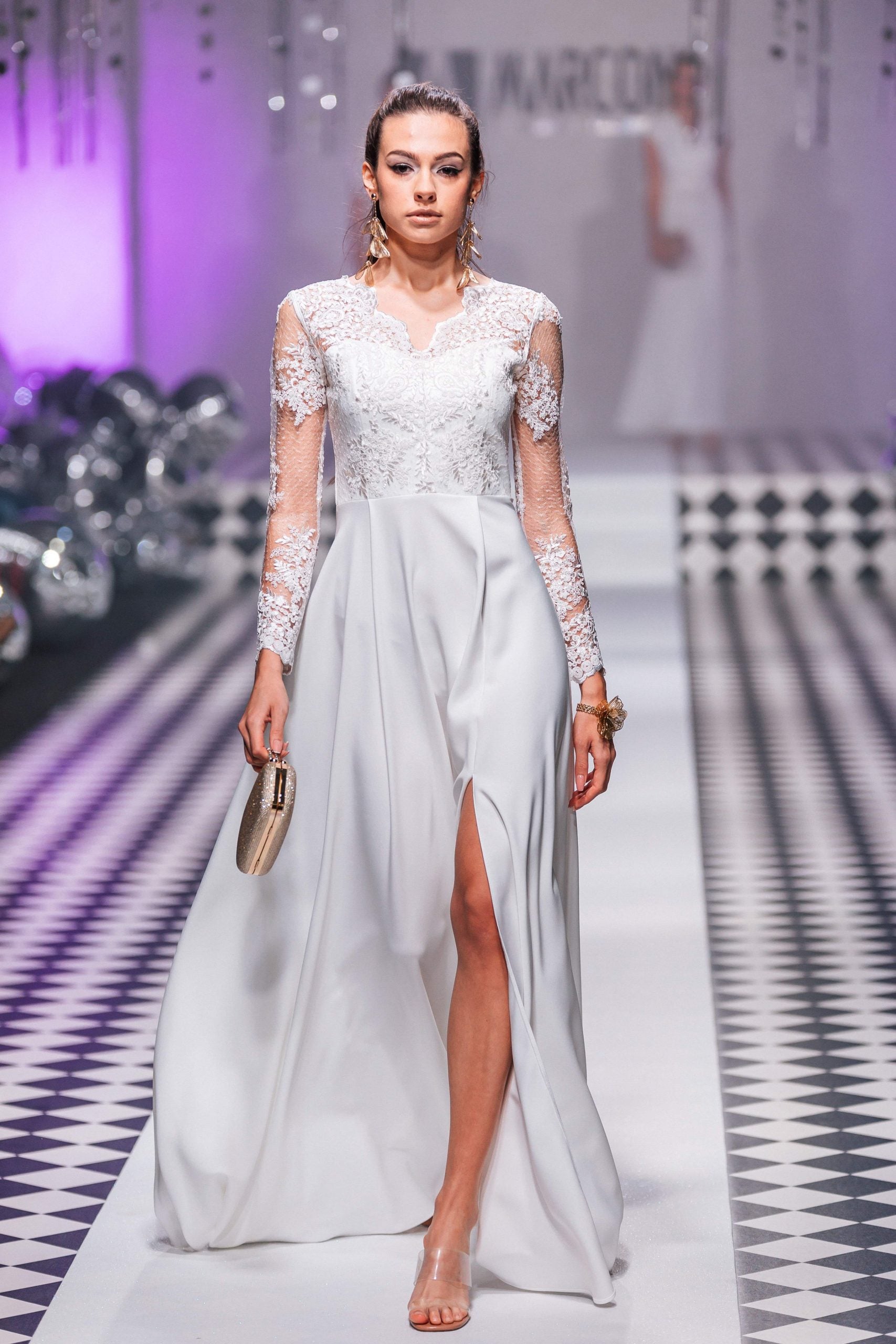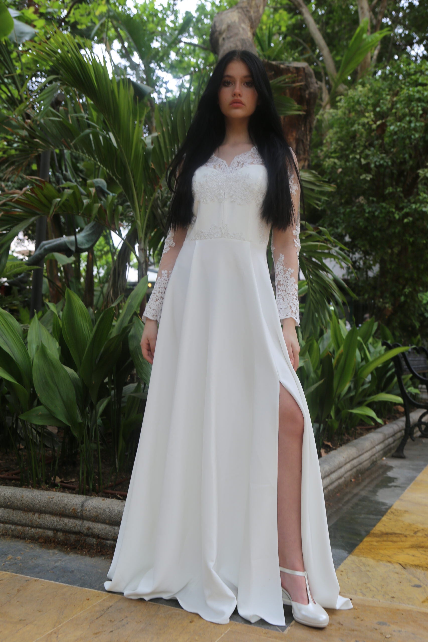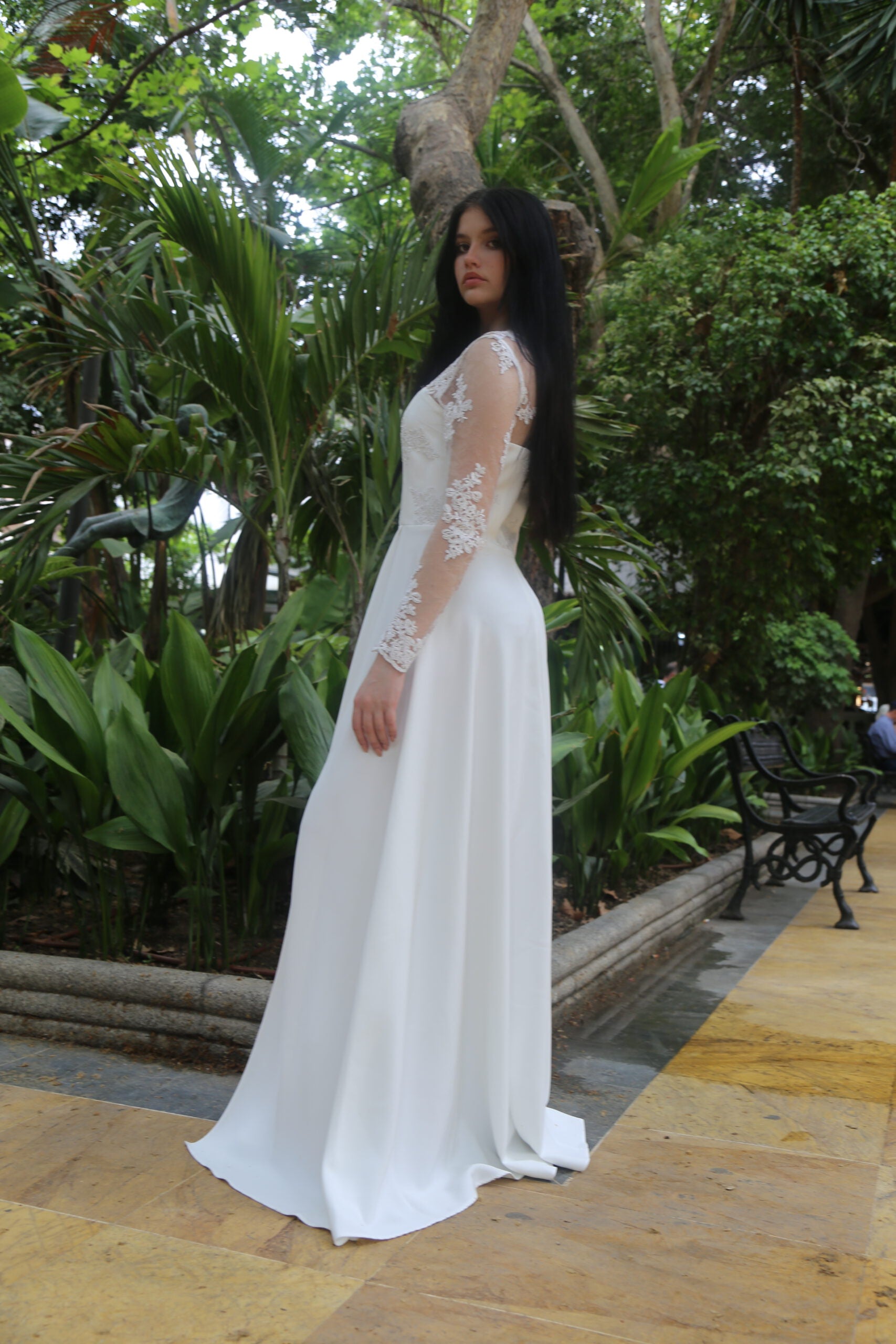 Zestawienie ponadczasowej koronki z delikatną tkaniną to niezapomniany look dla każdej przyszłej panny młodej. Dopasowana góra, i luźno puszczone biodra tworzą bardzo atrakcyjną całość. Zmysłowe rozcięcie na nodze nadaje jej lekkości i zwiewności, zapewniając przy tym niezwykłą swobodę noszenia.