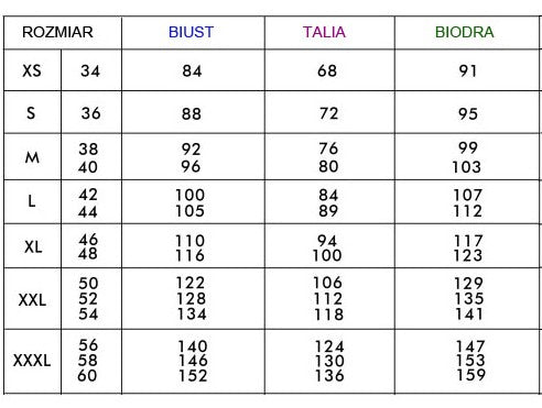 W tym modelu najważniejszymi wartościami jest obwód biustu oraz talii – która mierzona jest 2 cm powyżej właściwej talii.