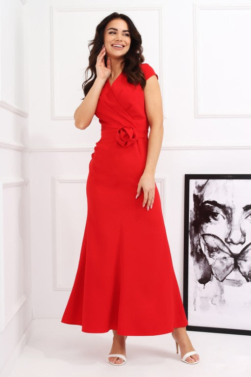 Wyjątkowa i olśniewająca sukienka z dekoracyjnym kwiatem na pasku.