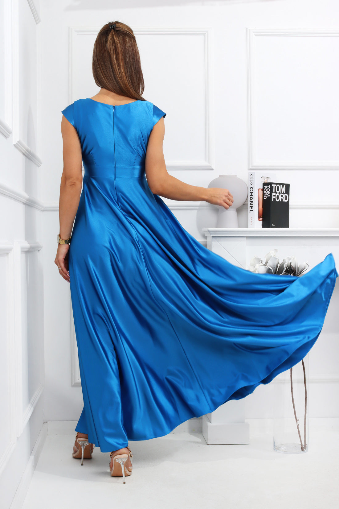 To idealny przykład sukienki na wesele. Fantastycznie eksponuje kobiece wdzięki, jednocześnie tuszując drobne niedoskonałości. Wcięcie pod biustem i luźno puszczone biodra wysmuklają sylwetkę, i sprawiają, że wygląda ona zgrabnie, zapewniając przy tym niezwykłą swobodę noszenia. Rozcięcie na nodze dodaje jej zwiewności i lekkości.